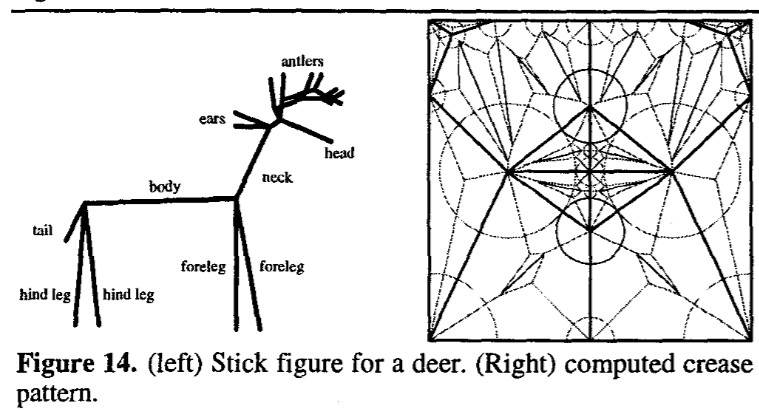 For an experienced folder, a crease pattern contains essentially all necessary information. Around this point in our story, Robert shows up. One question he studied was whether it is possible to generate a crease pattern automatically from a more human-friendly representation. He focused on the “stick figure” format and often used the following comparison: it is not too hard to create a stick figure, and it is not too hard to fold from a crease pattern, but producing a crease pattern from a stick figure is not a simple task.